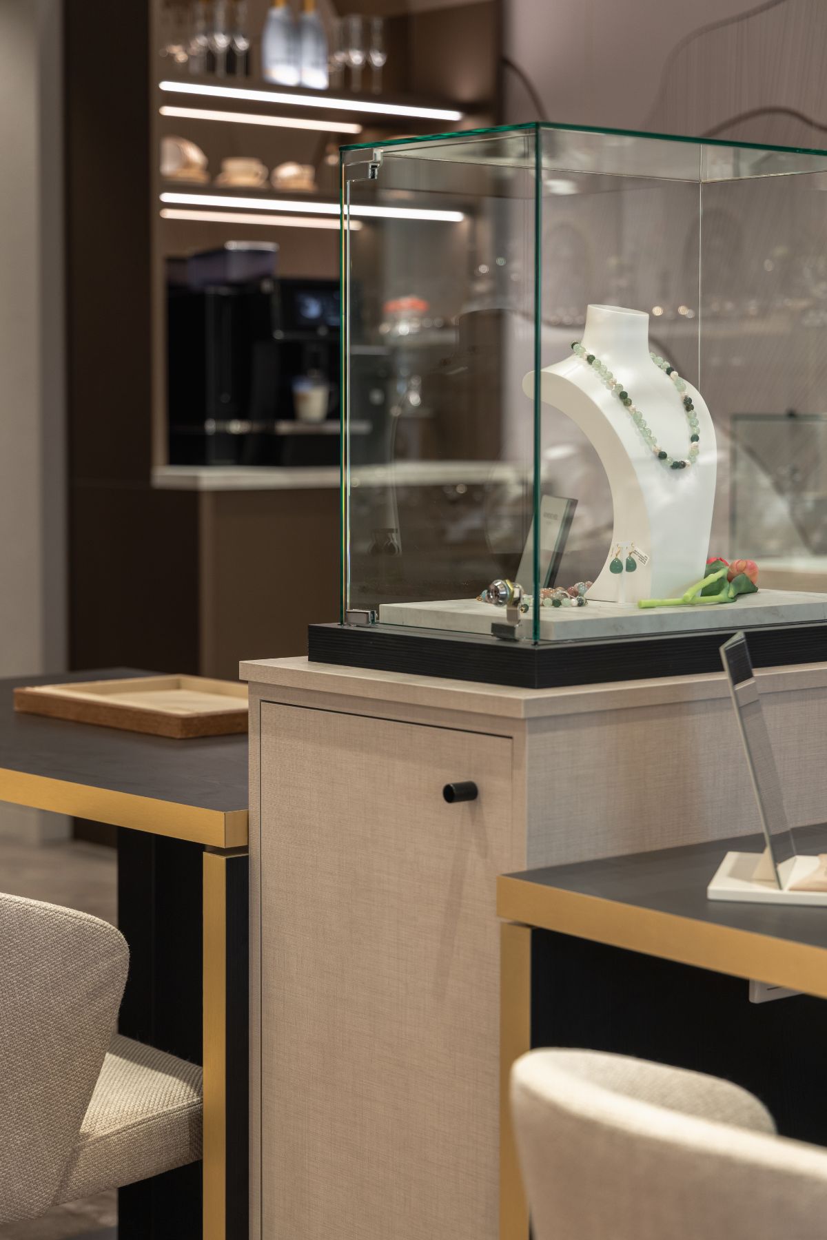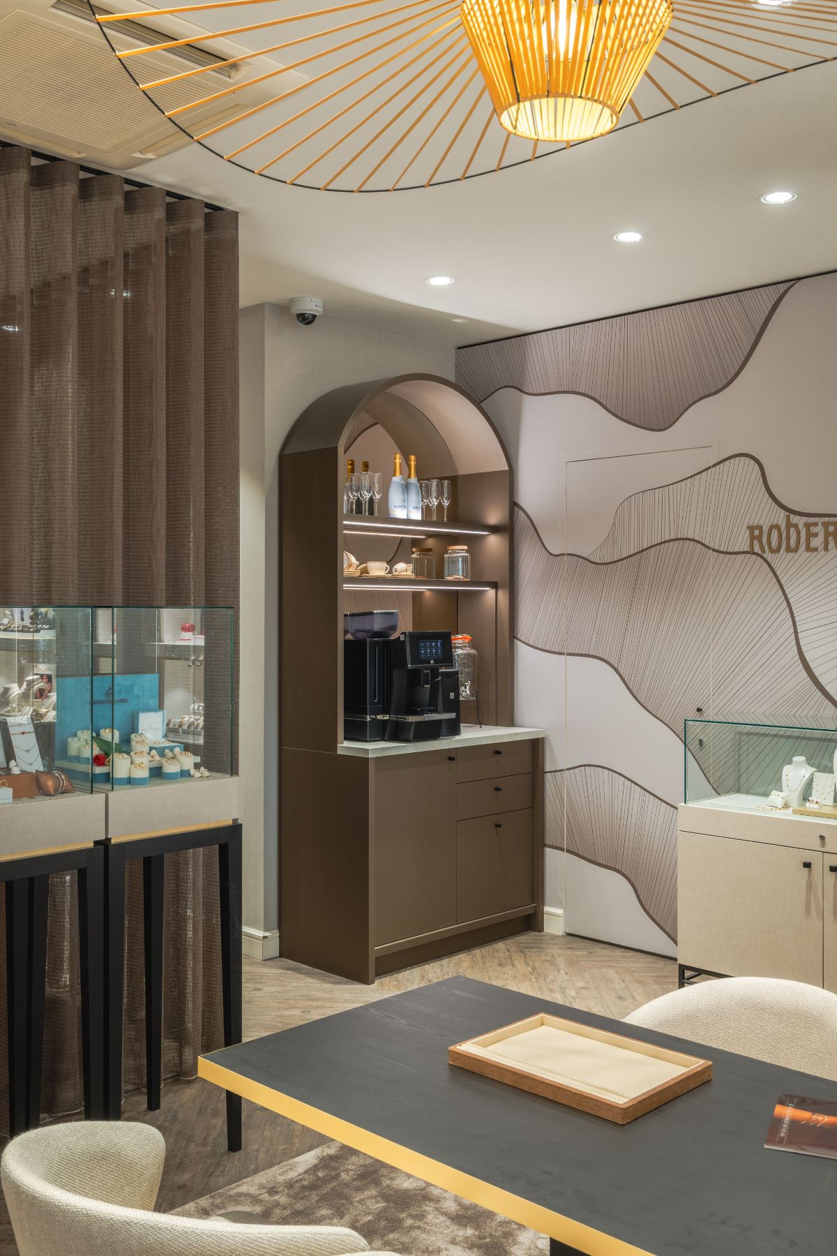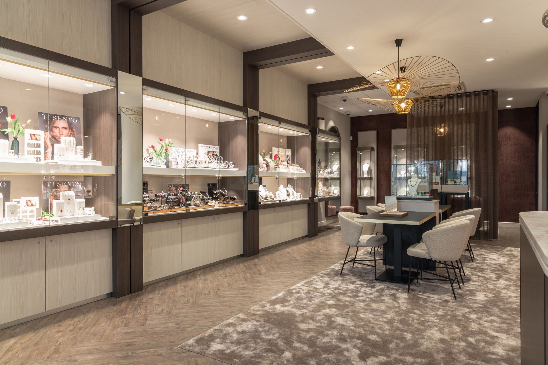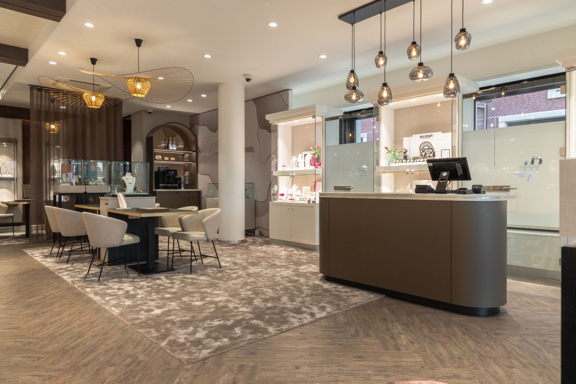 De routing werd volledig herzien. Achter in de winkel is nu een mooie, chique verkoophoek gecreëerd waar klanten rustig kunnen zitten. De wandmeubels en het middendeel zijn grotendeels van Forbettershops.com. In het midden van de winkel, aan de rechterkant, is de balie geplaatst. Hierdoor is er een nieuwe routing ontstaan waarbij klanten vrij kunnen winkelen langs de linkerwand. Kleuren en materialen zijn warm, modieus én tijdloos. Het project werd turn-key aangepakt: vloer, plafond, verlichting, interieur, behang en beglazing. We hebben met genoegen samengewerkt met de oom van Robert den Haag, die de installaties heeft aangepast. Robert en Roos, veel succes en geluk met jullie nieuwe winkelbeleving!