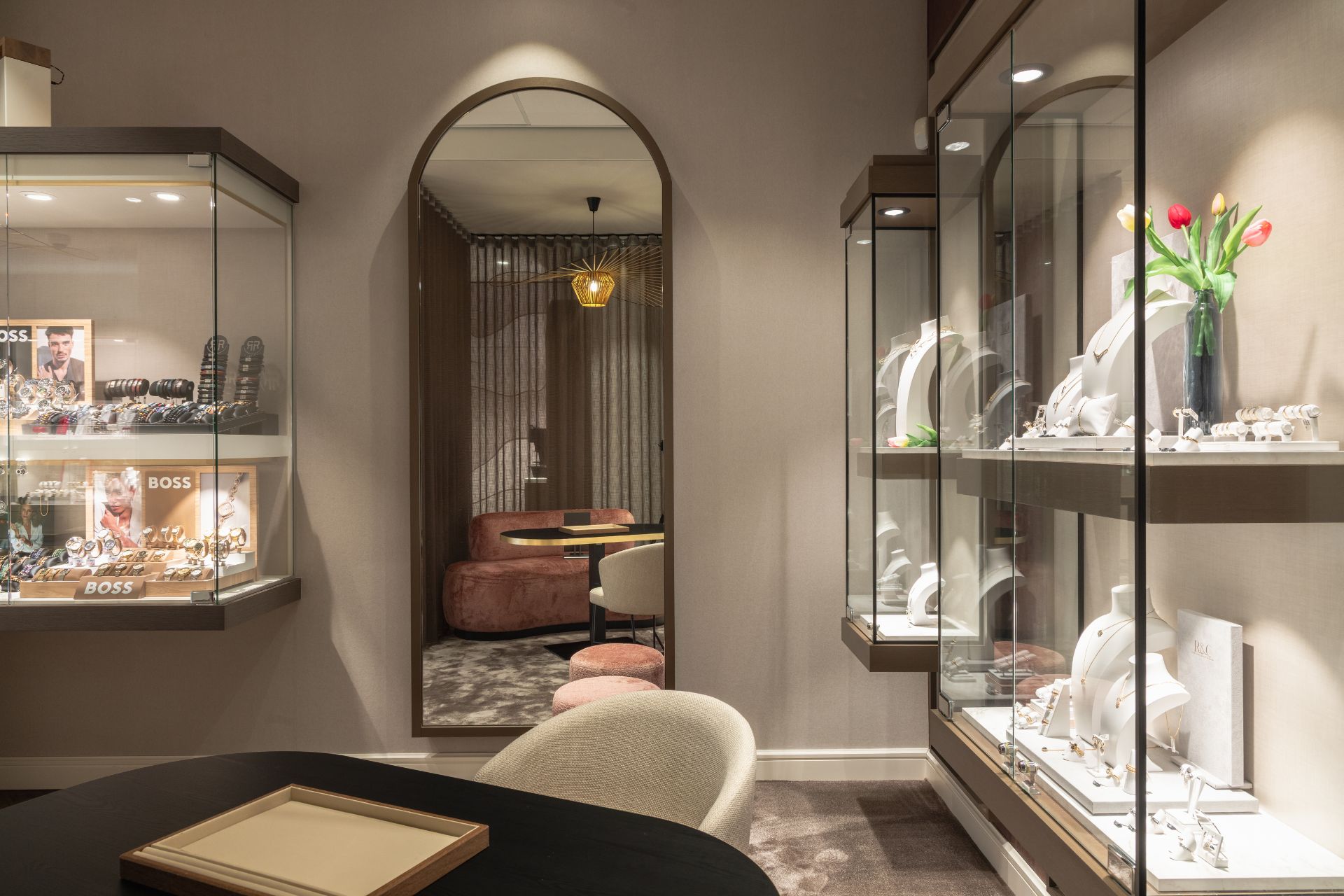 In 2014 verhuisde Robert zijn winkel naar het nieuwe winkelcentrum van Waddinxveen. Na 11 jaar vond hij het tijd om de winkel te restylen: moderner, warmer en beter geschikt om klanten rustig te kunnen helpen in een inspirerende setting. En ook nog veiliger: we integreerden een sluis, een sas om ongewenste gasten tegen te houden. Robert den Haag en dochter Roos den Haag klopten voor hun verbouwing opnieuw aan bij WSBdesign.com en Forbettershops.com. Kort voor deze verbouwing hebben we met veel plezier en succes samengewerkt aan de complete winkelrenovatie van Robert den Haag Juweliers in Rotterdam-Ommoord.