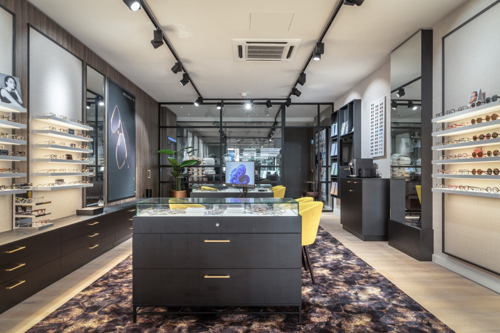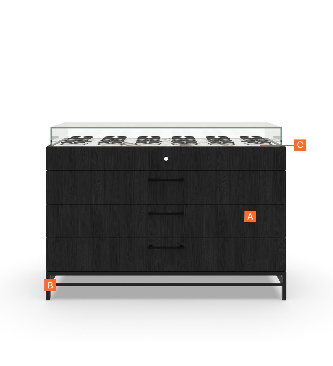 Freistehende Glasvitrine für Brillenpräsentation . Vitrine über Schublade zugänglich, wodurch das Wechseln der Brillen erleichtert wird. Zwei im Unterbau integrierte Schubladen zur Aufbewahrung. Möbel mit dezentem Stahlfuß.Spezifikationen