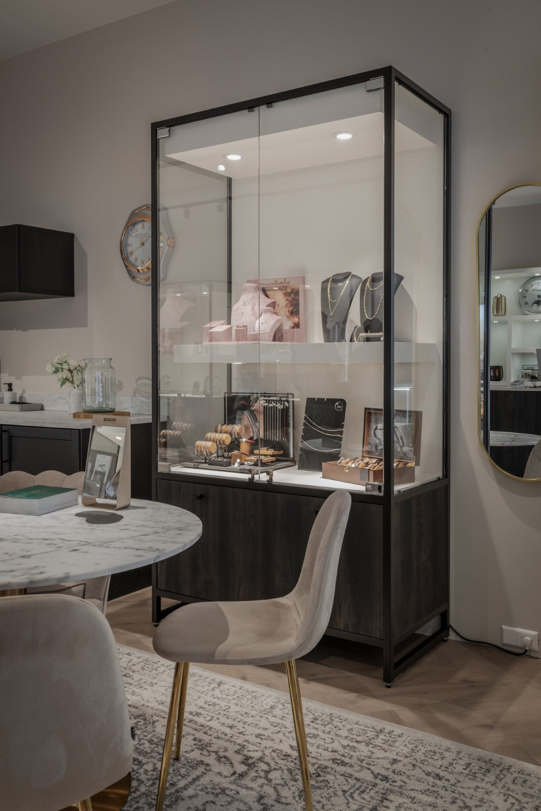 Die Vitrinen dieser Produktlinie sind formschön und fsicher ür Juweliere und Museen konzipiert. Die Edinburgh C Middle ist eine Vitrine mit 1 Schublade. Es ist möglich, die Edinburgh-Möbel miteinander zu verbinden, wie Sie auf dem letzten Stimmungsbild sehen können. Seit 1958 stellen wir Ladeneinrichtungen für Juweliere her. Sehen Sie sich hier unser komplettes Sortiment an.
