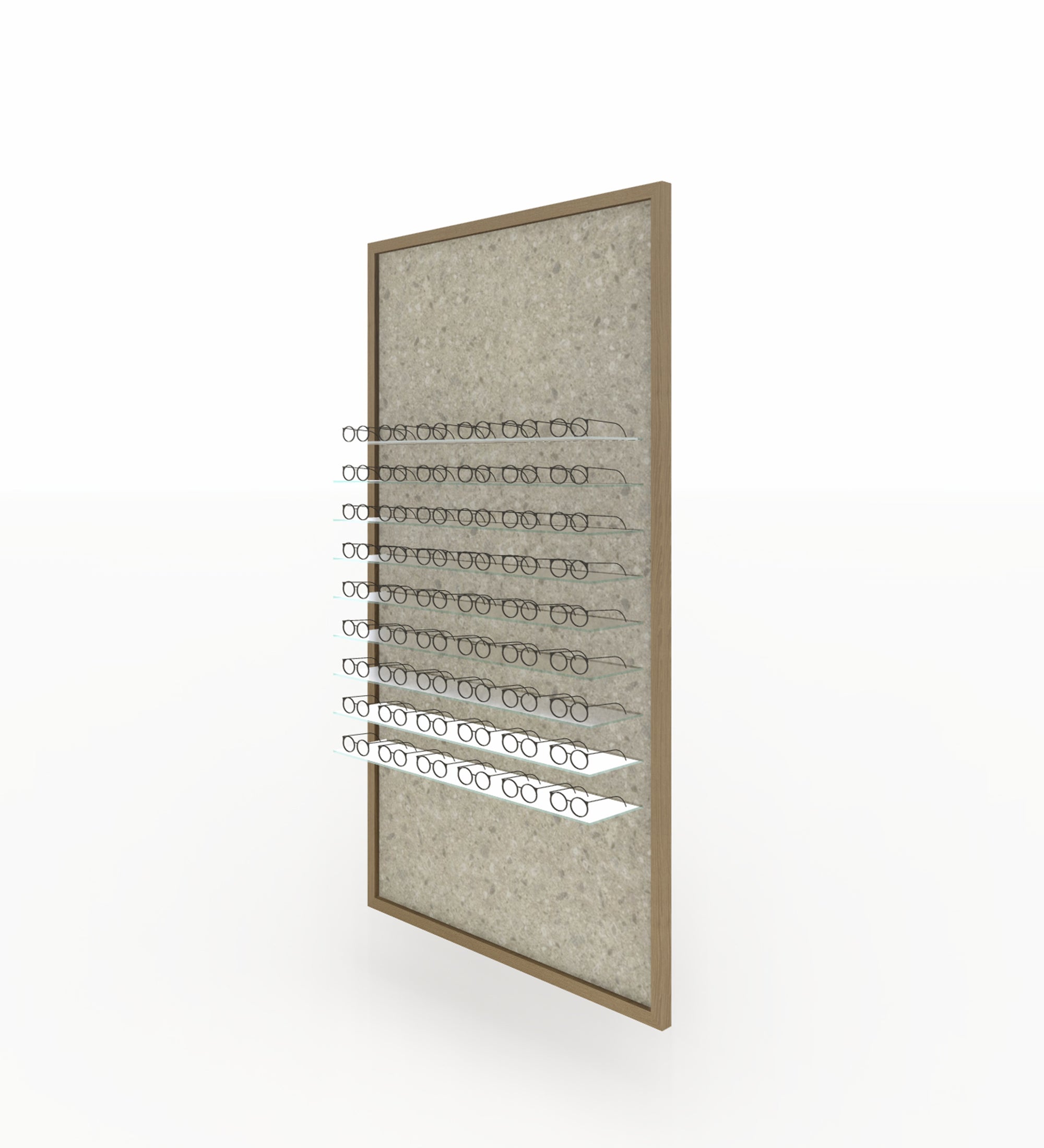 Wall panel with 9 continuous glass shelves for presenting your glasses/sunglasses. This panel has room for no fewer than 63 frames – ideal for presenting your high-end collection.