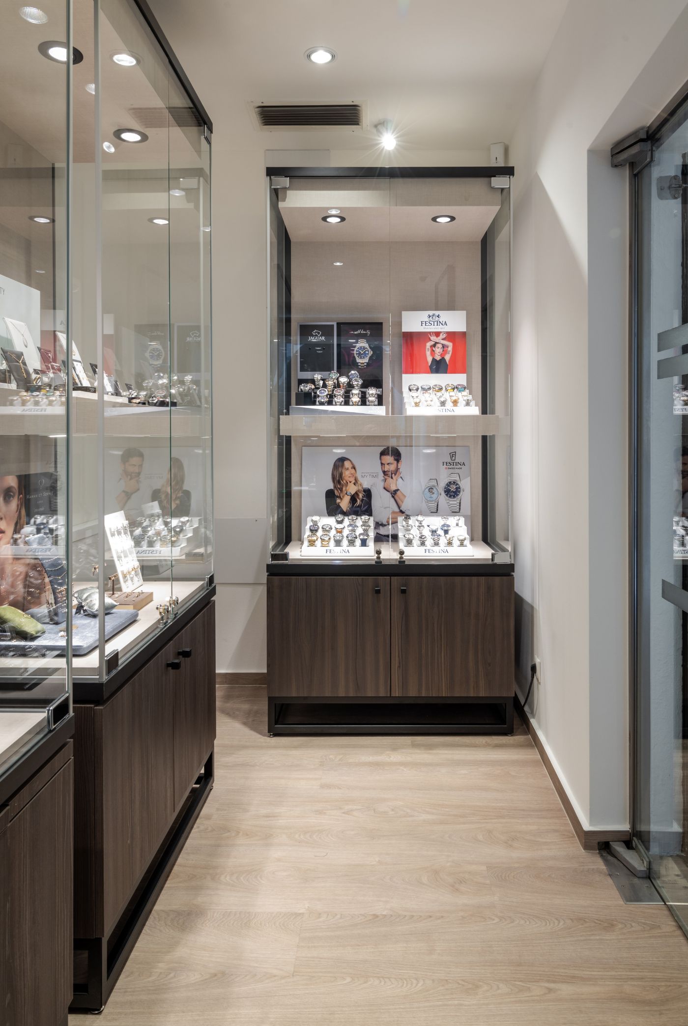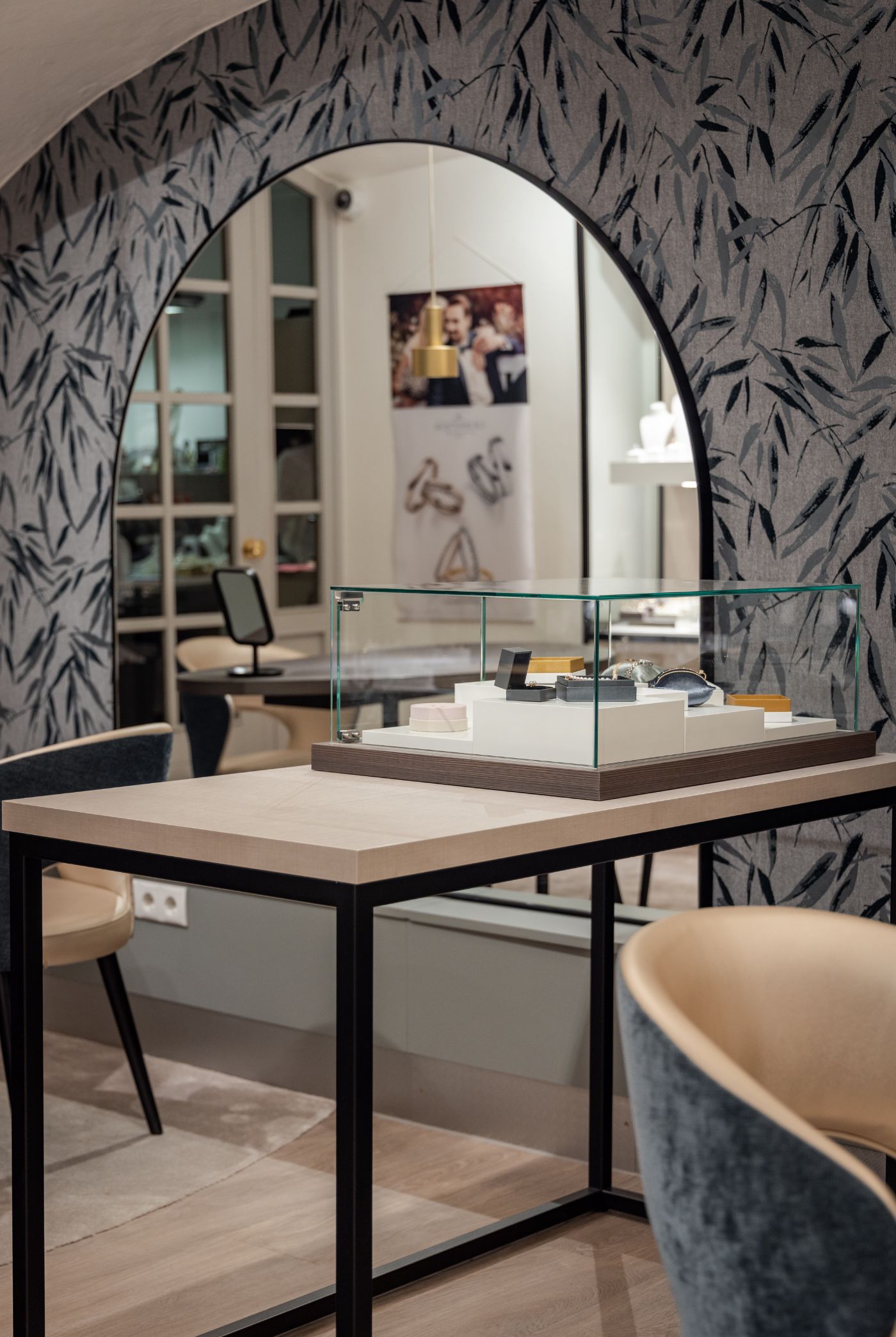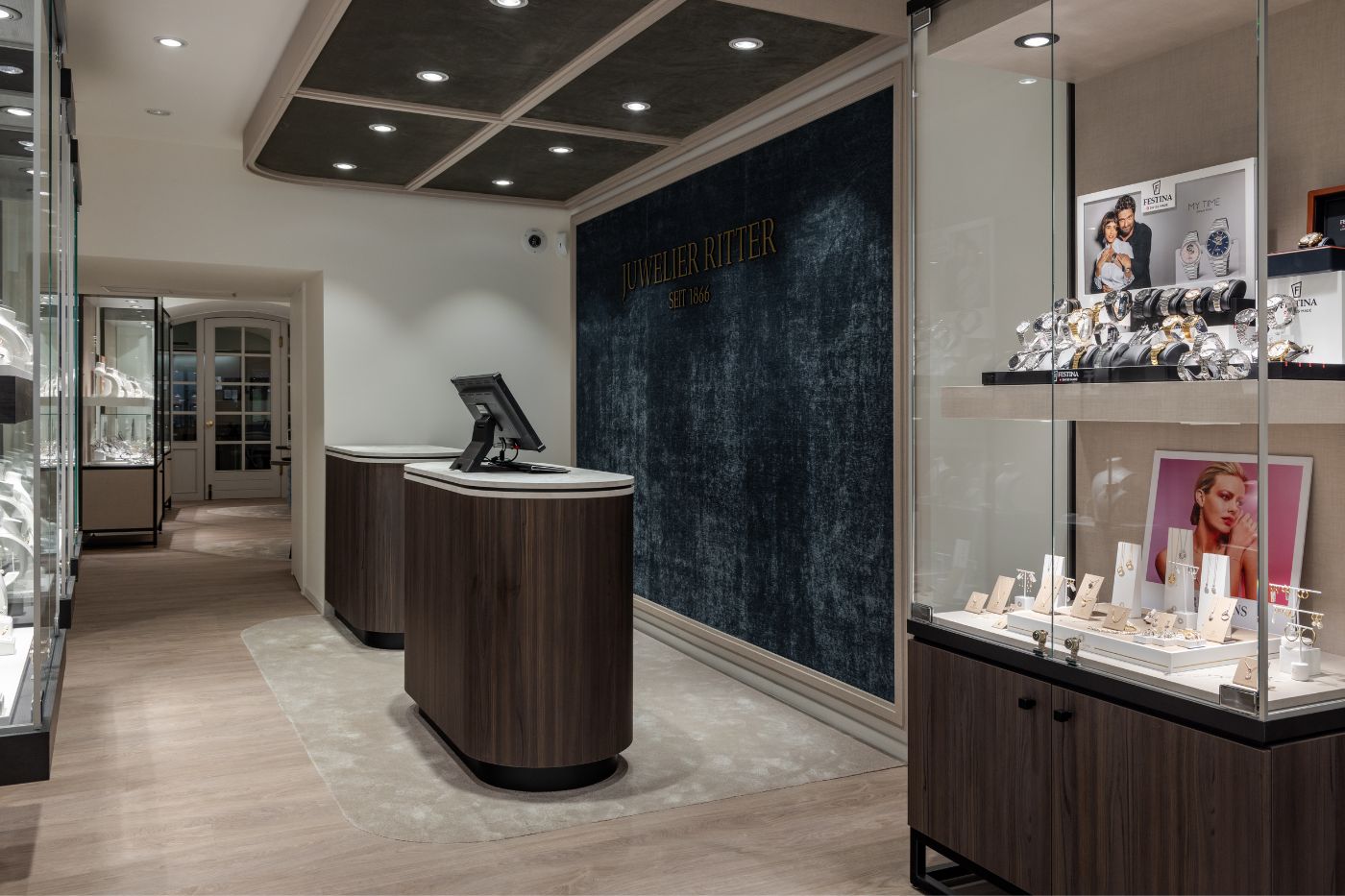 Des essences de bois foncé nobles, des murs d’accent bleu profond et des vitrines en verre sur mesure mettent en scène bijoux et montres avec élégance. Les îlots de conseil discrets sous les arcs doux invitent les clients à découvrir les trésors de la maison dans une atmosphère calme et privée. Ainsi se crée un environnement où tradition et esthétique de luxe moderne se rencontrent parfaitement. Le résultat est une boutique qui combine harmonieusement style, fonctionnalité et expérience client, et où les visiteurs se sentent immédiatement les bienvenus et à l’aise.